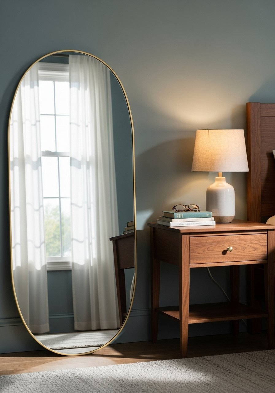 A large 36-inch round mirror made the biggest single visual change in my bedroom. I leaned mine opposite a window and the reflected light opened the space. Mirrors also work as art when framed in brass or black. Styling tip: anchor the mirror with a low console or a stack of books. Mistake to avoid: hanging a mirror too high — it should sit at eye level when standing to reflect more light.