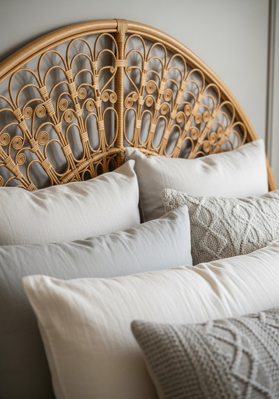 A woven rattan headboard changed the feel of my bedroom overnight. It provides a focal point without color. I used a 60-inch rattan headboard look and kept bedding light. This creates contrast through texture rather than hue. Mistake: pairing a busy patterned duvet with a textured headboard — that competes. Instead, pick solids and play with throw sizes: one euro, two standard, one lumbar.