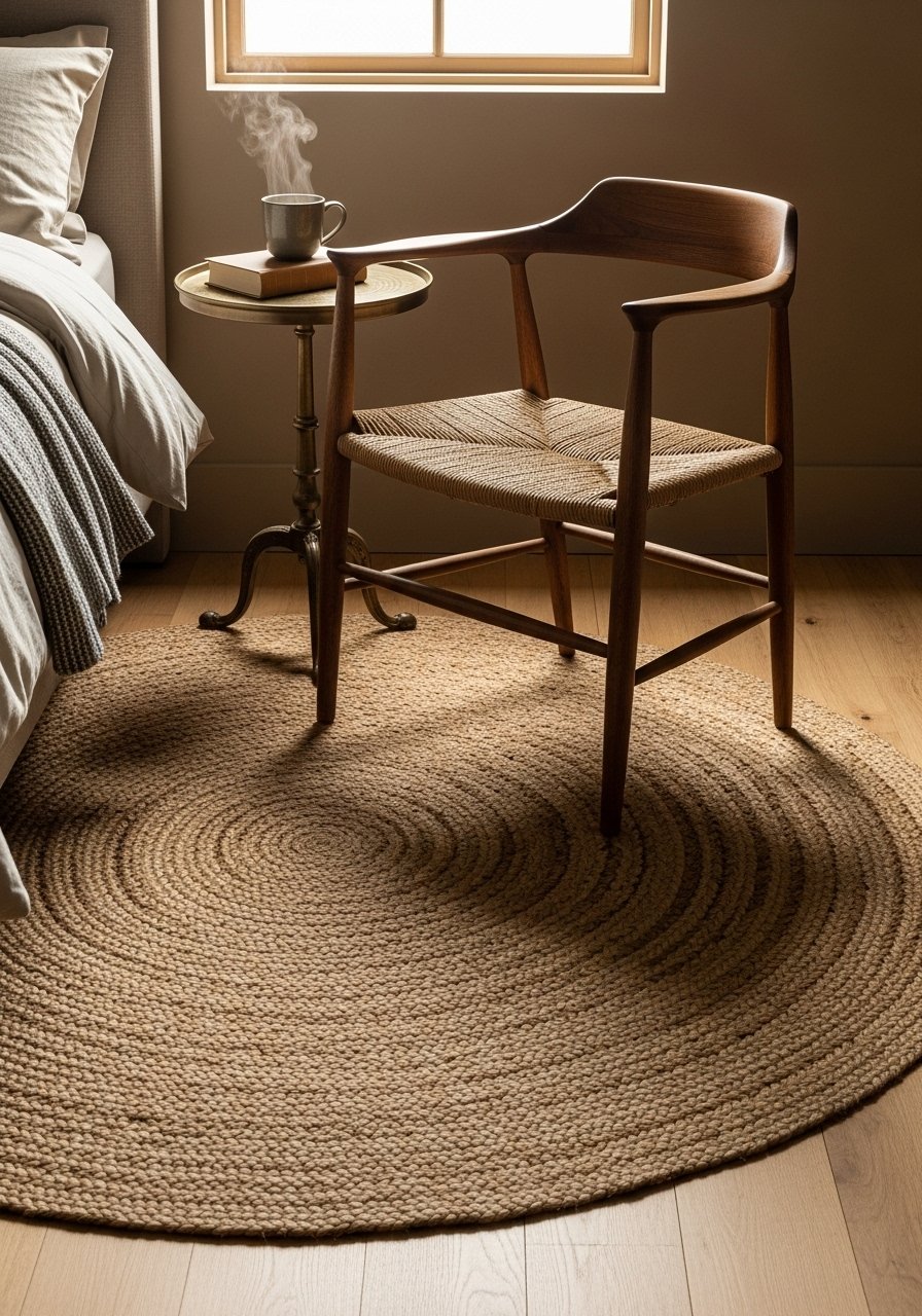 I chose a 6-foot round jute rug for texture and warmth. Natural fibers add softness underfoot and layer well with wood floors. For a bed, I recommend at least a 6-foot rug at the foot or an 8×10 under the whole setup. Avoid cheap flat rugs that slide — use a non-slip pad. Brands I reach for: Safavieh and Loomy for quality neutrals.