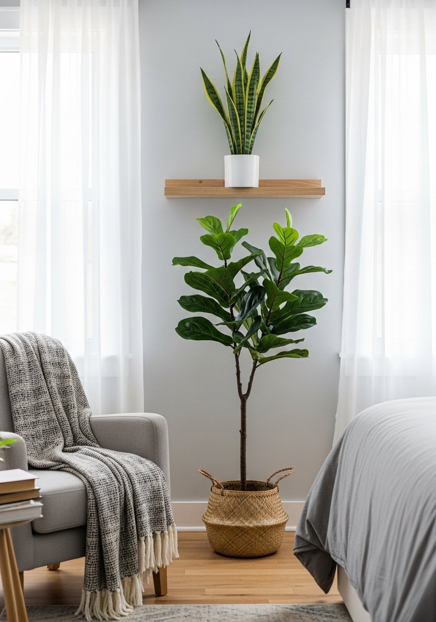 I prefer one large plant over many tiny ones. My 6-foot artificial fiddle leaf fig brings height without upkeep. For real-plant lovers, a snake plant or pothos works in low light. Tip: use a woven basket or ceramic pot to tie the plant into the room. Mistake: grouping mismatched pots — keep pot styles consistent for a curated look.
