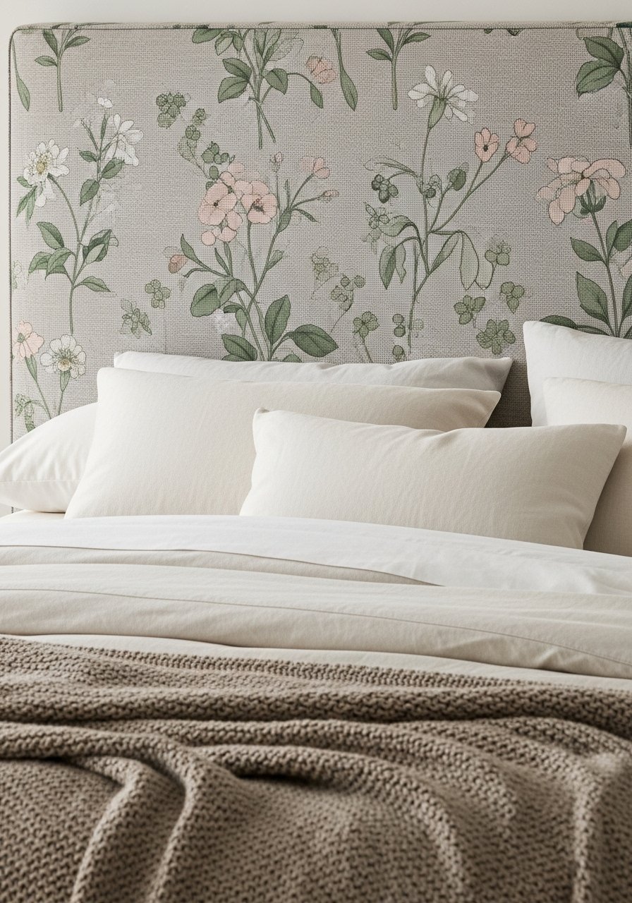 I reupholstered a thrifted headboard in a muted floral fabric and it instantly anchored the room. The pattern feels intentional but not loud because the palette is soft—sage, blush, and warm cream. I paired it with linen blend curtains and a cream chunky throw. Styling tip: keep pillows neutral and add one small floral lumbar for balance (rule of 3: two solids + one floral). Mistake to avoid: choosing a tiny-scale floral that reads busy from the doorway.