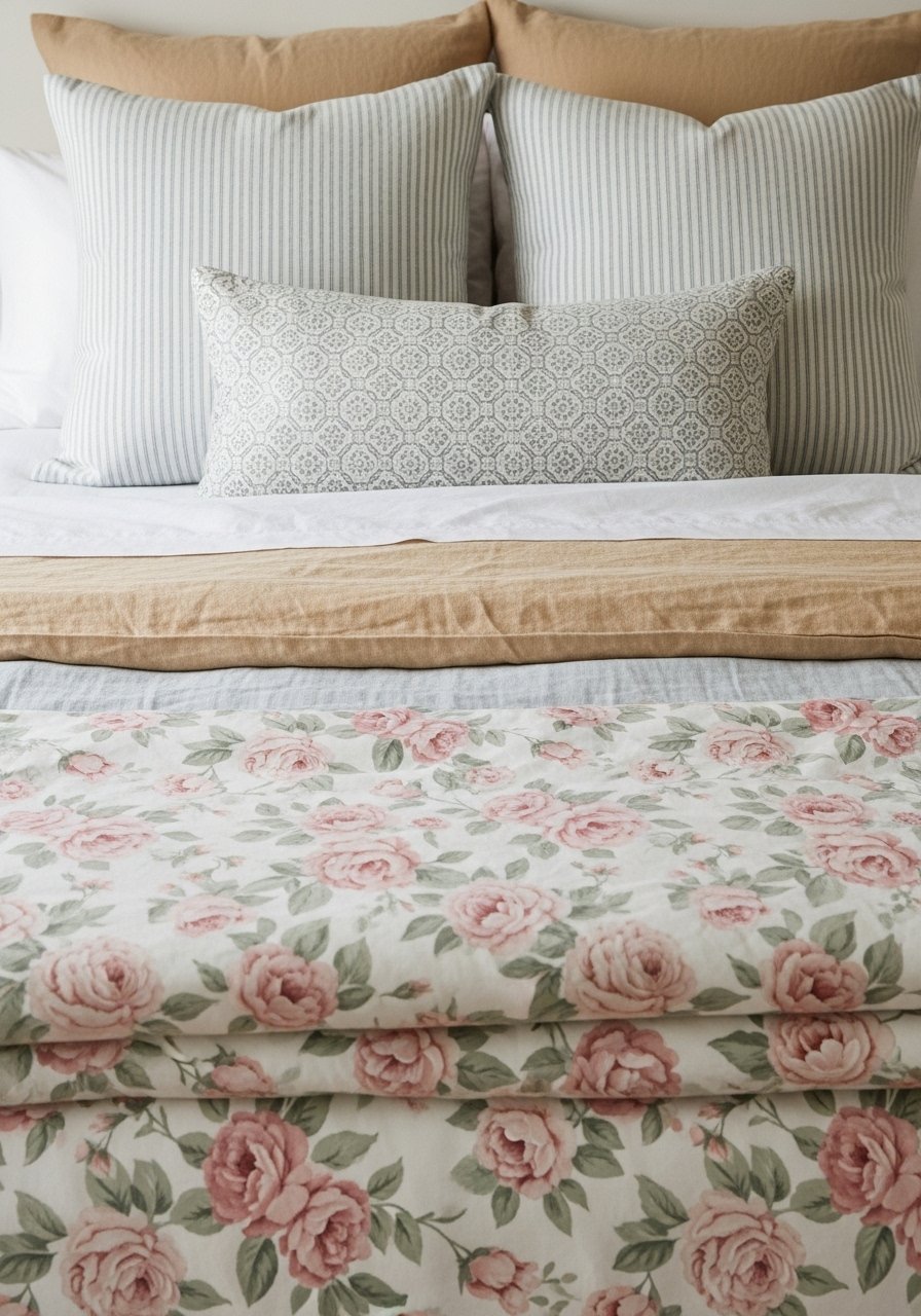 Switching just the duvet or adding a floral quilt is the fastest refresh. I like a neutral base—linen duvet—and a folded floral quilt at the foot. I used velvet pillow covers for texture contrast. Tip: keep a 2:1 texture ratio—two soft textures to one smooth. Mistake: mixing too many floral scales; choose one pattern scale and one neutral.