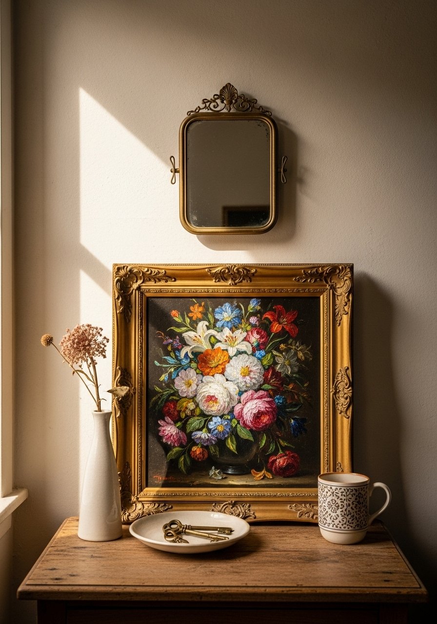 I hunt flea markets for floral art and frames—these give history. Thrift frames pair well with new mats (white mats). Tip: repaint an old frame in warm brass spray paint to modernize it. Mistake: leaving yellowed mats; always refresh the mat.