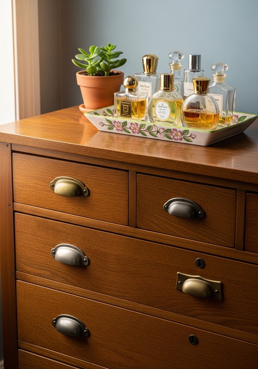 I replaced plain knobs with mixed-metal pulls and added a small floral tray. Mixing brass and matte black keeps it current (CB2 and West Elm carry these looks). I paired with a brass bedside lamp. Mistake: matching all metals—mixing feels intentional.