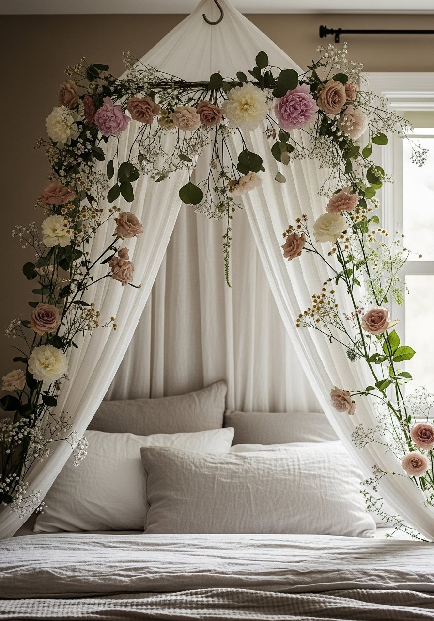 I draped a lightweight floral fabric as a partial canopy to cozy up my bed. Use a soft, small-scale floral to avoid visual noise. I sourced a length of floral voile and hung it with a single hook. Mistake: heavy fabric that overwhelms the bed—keep it airy.