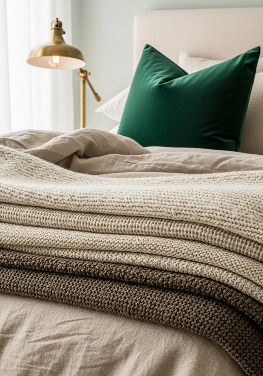I layered a linen duvet, a cream chunky throw, and an emerald velvet pillow. The neutral base makes the green pop without feeling loud. I used satin+linen duvet cover and velvet pillow covers. Tip: stick to 2:1 texture ratio (soft vs. smooth). Avoid too many competing accent colors; that flattens the glam.