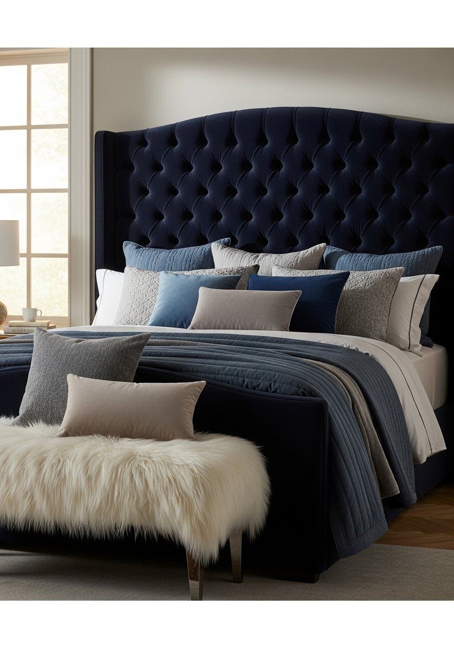 I chose a queen tufted headboard in navy velvet from an online retailer (I compared West Elm and CB2 styles). The height adds presence. I paired it with tufted velvet headboard, queen and faux fur bench cover. Mistake to avoid: picking a velvet tone that clashes with carpet. Swatch first or order returnable options.
