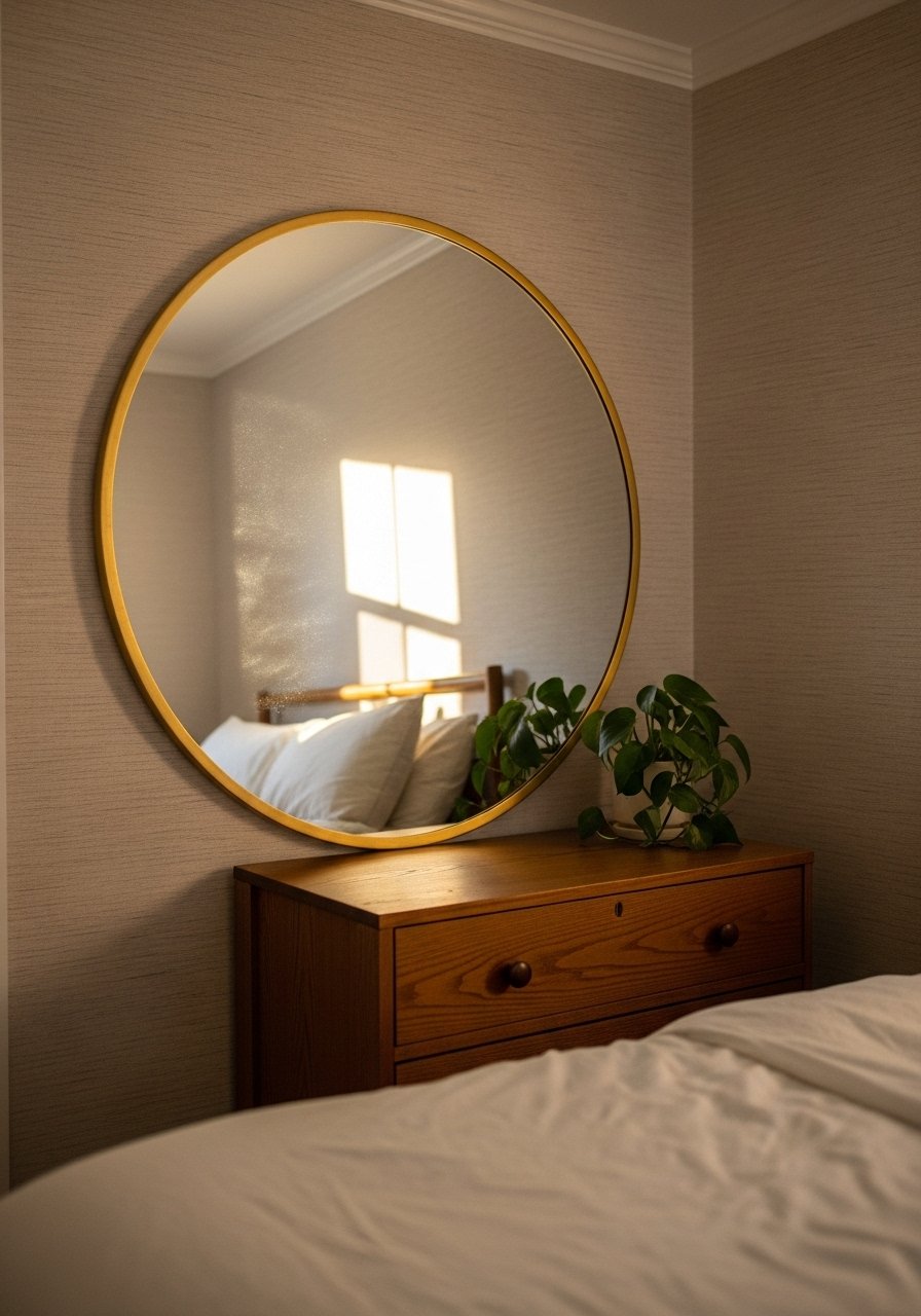 A 36-inch round mirror reflected light into my tiny room and visually doubled the space. I chose large round mirror, 36-inch brass frame. Tip: lean it slightly for a relaxed look. Common mistake: hanging it too high — eye level or slightly above bed height works best.