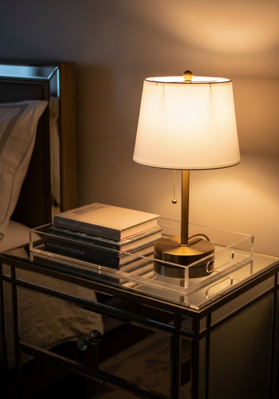 Mirrored nightstands reflect light and make the room feel airy. I used mirrored nightstand and a lucite tray search. Keep one drawer for clutter. Avoid mirrored pieces with visible fingerprints — microfiber cloths will be your friend.