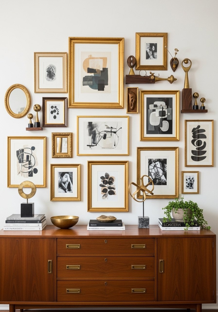 I thrifted frames at Goodwill and added new white mats. Then I balanced gold frames with a large statement piece. Use vintage brass picture frames 8×10 and 11×14 white mats. Rule of three for groupings. Avoid mixing more than two dominant frame styles.