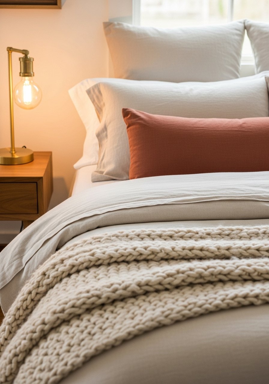 I used a base of linen sheets and a cream duvet, then added one bold accent—terracotta velvet pillows—to stop the palette from feeling flat. I recommend linen blend curtains 96-inch natural and chunky knit throw blanket cream. Stylist tip: keep a 2:1 texture ratio—two soft fabrics to one smooth (like velvet). Common mistake: too many competing colors. Limit accents to one or two tones.