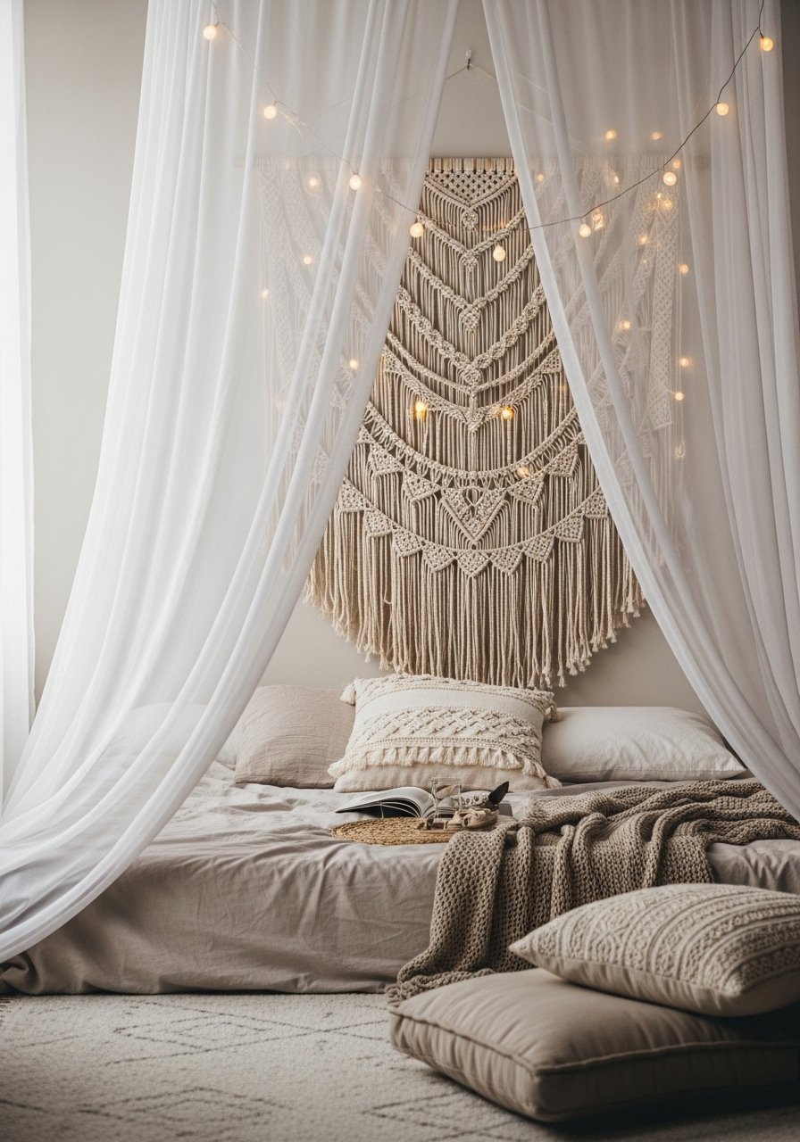 I draped a sheer canopy for softness and layered macramé and woven pillows. Velvet pillow covers set of 4 emerald add depth. The feeling is intimate and calm. Keep patterns to two kinds—one floral or geometric, one neutral weave. Mistake to avoid: overusing tassels; they look cluttered in very small rooms.