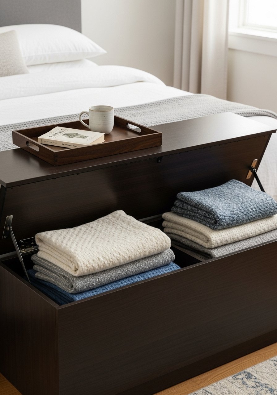 A storage bench 48 inch upholstered gives seating and hides extra bedding. I recommend built-in nooks or floating shelves for bedside books to free floor space. This solves clutter—one of the top pain points people tell me about. Mistake: choosing a bench that’s too deep; 15–18 inches works best for narrow rooms.