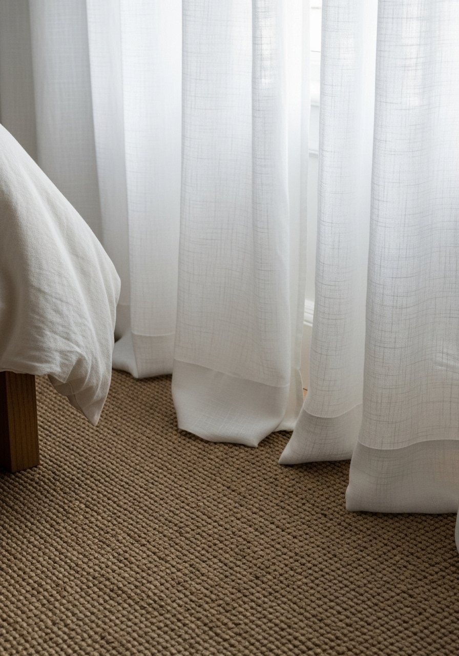 The rug and curtains decide the room’s scale. I went with an 8×10 jute rug because its neutral weave warms the floor without adding pattern. Aim to have the front legs of the bed or sofa on the rug. That anchors the layout.