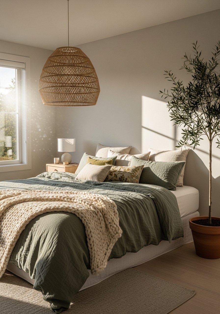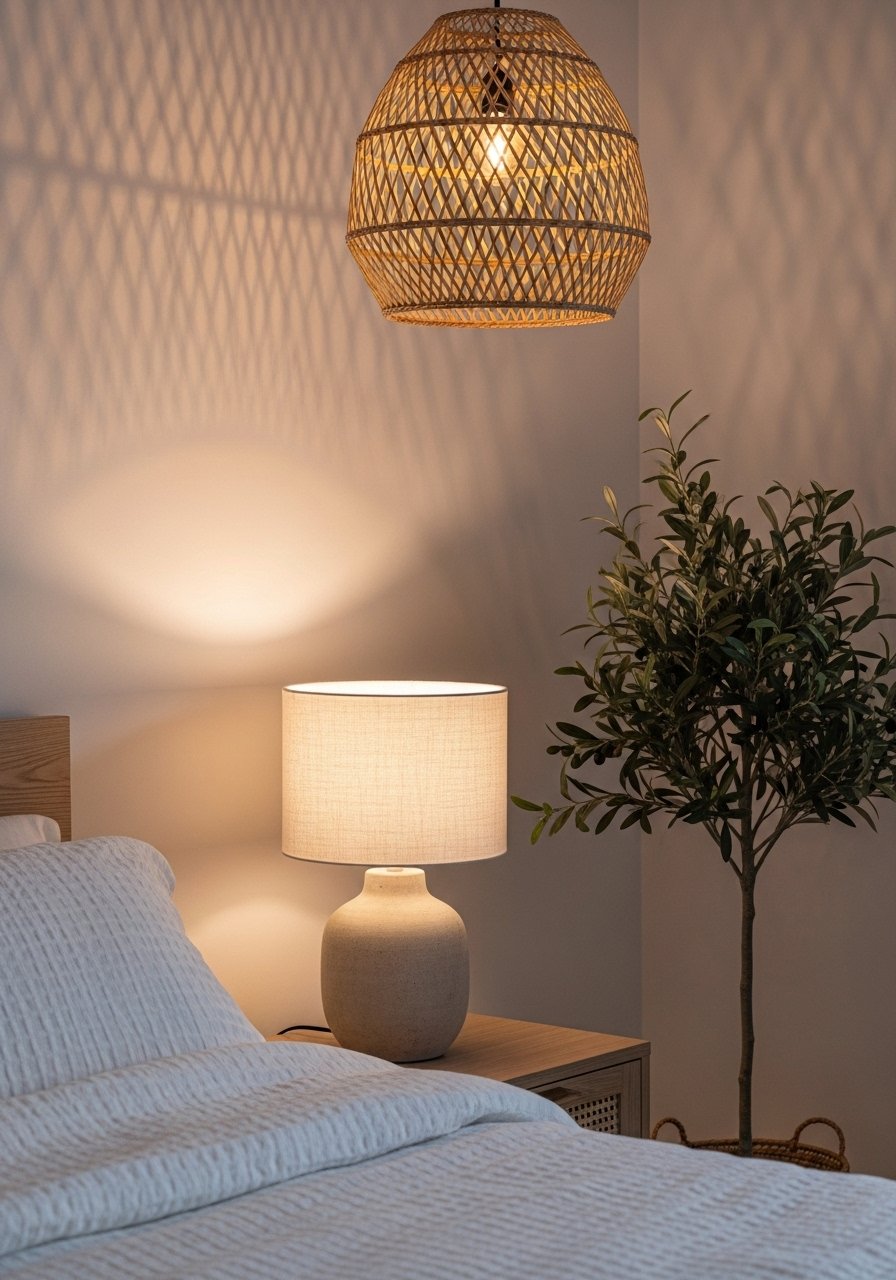 Lighting finishes the scene. Start with a dimmable overhead like a rattan pendant, 15-inch. It casts soft shadows and adds texture. Add a table lamp with a linen shade on the nightstand for reading light. Use warm bulbs (2700K) and aim for layered sources—overhead for general light, lamp for task, and a small accent light if needed.