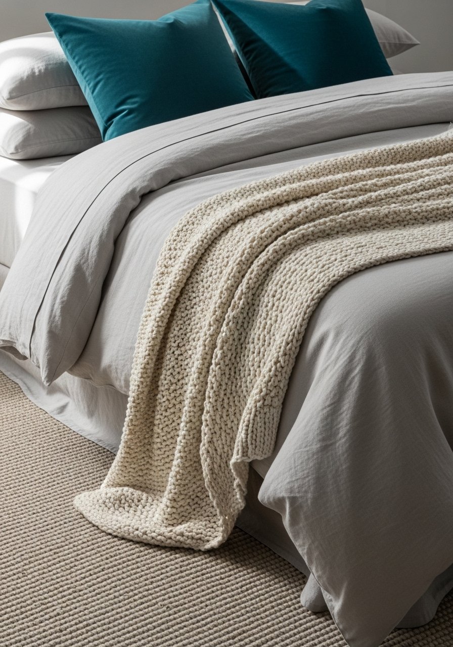 I built this look around linen bedding and natural textures. Layer a linen duvet, a chunky knit throw, and two velvet accent pillows in deep teal or terracotta. I used linen curtains to keep light soft. The single bold color ties everything together and keeps the room from feeling flat. Styling tip: use odd numbers—three cushions, one throw, one rug. Common mistake: too many competing colors. Stick to 2 neutrals + 1 accent. Brands I like: West Elm for linens, Target for budget pillow covers.