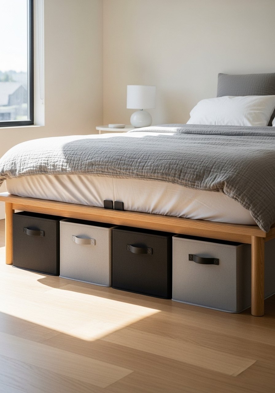 I use low-profile storage bins under my platform bed. They hold off-season clothes and free the closet. Pick bins with lids and label them. For a cohesive look, use fabric bins in neutral linen tones. Mistake: using open boxes that look messy. Brands: The Container Store and IKEA both have slim under-bed options.