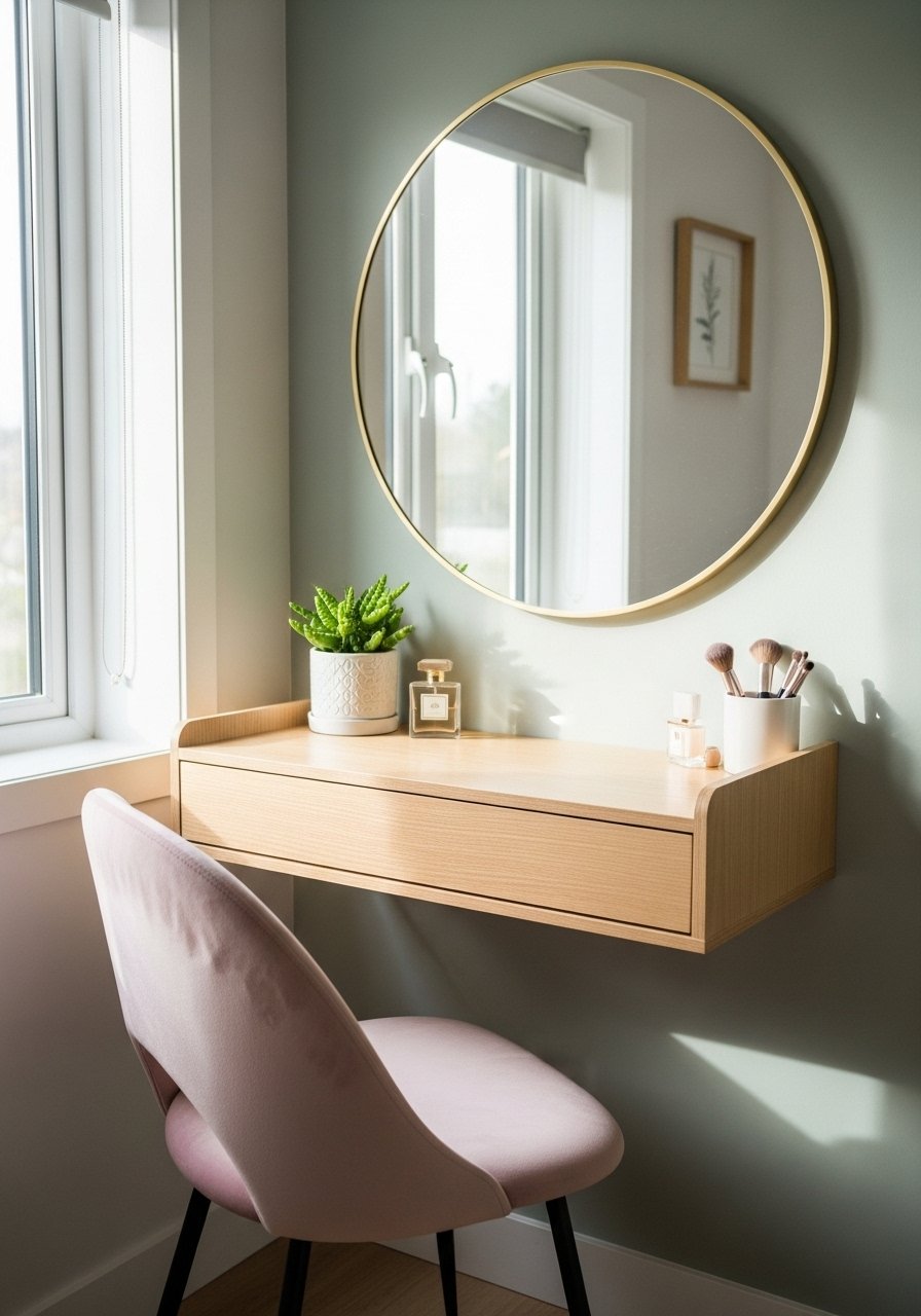 Working from my bedroom meant I needed a compact desk that doubles as a vanity. I chose a small wall-mount desk and a round mirror. Add an LED makeup light or Edison LED bulb for flattering color. Tip: keep daily items in a tray to clear it quickly. Mistake: too many cosmetics on view—use a drawer organizer.