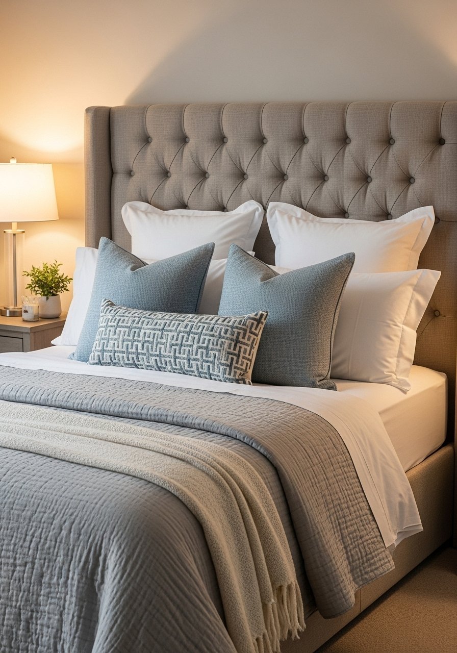 Soft Headboard and Layered Pillows for Comfort