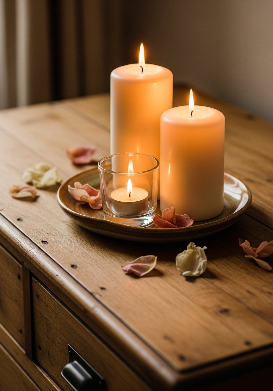 I arranged three different candles on a small ceramic tray for instant warmth. I used a 3-inch pillar, a 6-inch pillar, and a votive—odd numbers and height variation feel intentional. I like scented soy pillars in blush rose with one unscented pillar for balance. Tip: use flameless LED versions when you want the look without the worry (flameless pillar candles). Common mistake: placing candles too close to linens. Keep them on a hard surface and at least 6 inches from fabric.