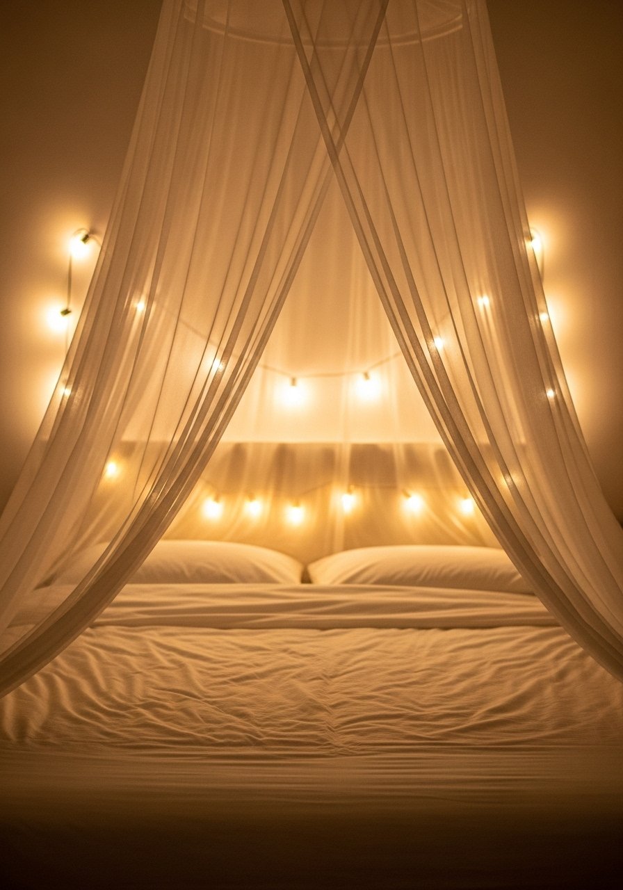 I draped a sheer canopy and tucked warm LED string lights behind it. The canopy softens the room and the lights add a flattering glow—perfect for low-key Valentine’s evenings. I paired sheer canopy panels with warm LED string lights. Avoid heavy fabrics; they read too formal. Styling ratio: light fabric + one textured throw = romantic but simple.