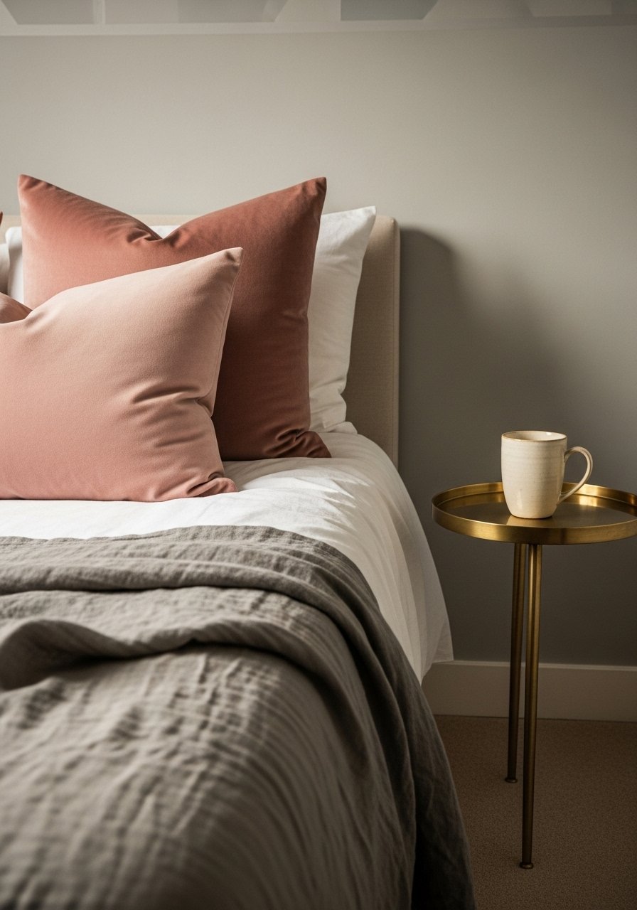 I used blush pillows and a velvet throw against layered neutrals—linen sheets and a cream knit throw—to add warmth without cliché reds. I recommend blush velvet pillow covers (18×18) and a cream chunky knit throw. The trick: keep blush to one or two pieces so it reads elegant, not themed. Mistake to avoid: matching everything exactly—mix textures (velvet + linen + knit) for depth.
