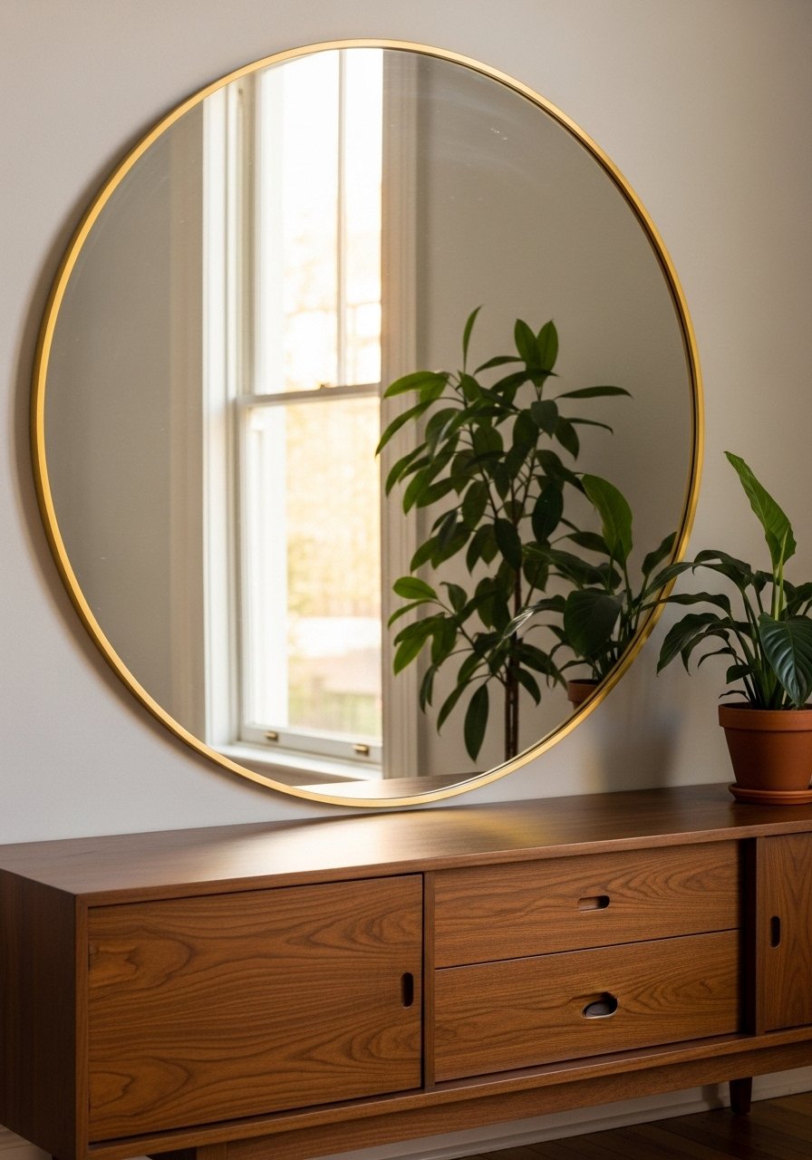 I leaned a large round mirror to bounce light and make the room feel larger and more intimate. I used a 36-inch brass mirror near the bed to reflect candlelight and twinkle lights. Mirrors also let you enjoy your styling choices from a new angle. Common mistake: hanging a mirror too high. Keep the center at eye level or slightly below.