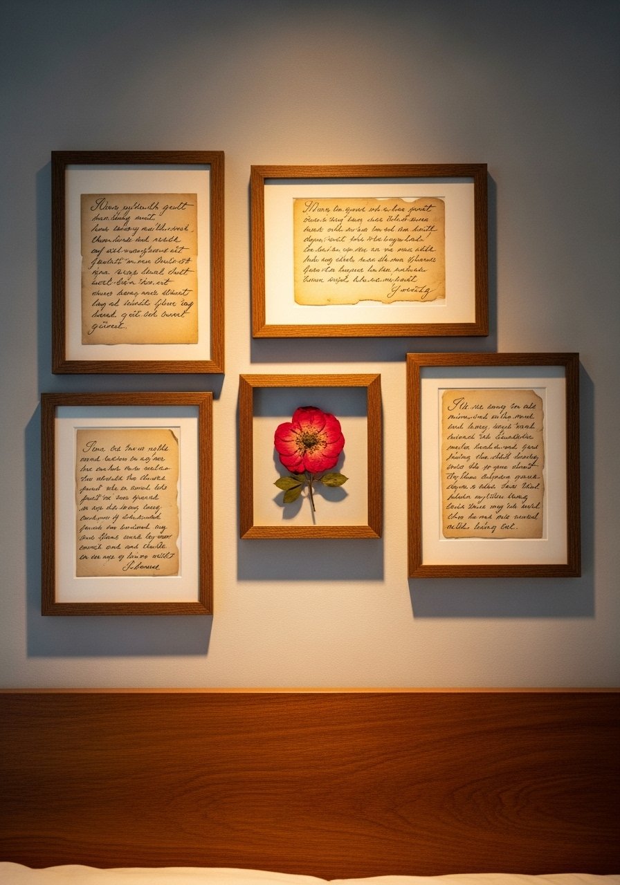 I created a tiny gallery of framed love notes, ticket stubs, and a pressed flower. I used vintage brass frames 8×10 and white mats to keep it sophisticated. This beats generic wall art because it’s personal. Styling tip: use odd numbers and vary vertical/horizontal frames. Mistake: crowding the wall—give each piece breathing room.