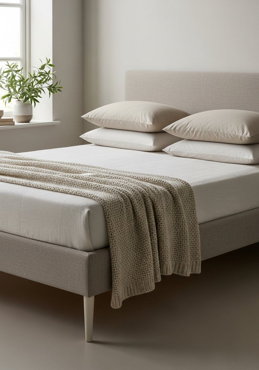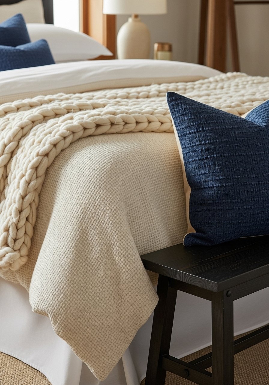 I layered a cream waffle duvet with a chunky knit throw and one deep-blue lumbar pillow. The cream base keeps the room calm. The single bold pillow reads like punctuation. I used this waffle duvet and a chunky throw. Rule of three works: duvet, throw, accent pillow. Mistake to avoid: too many competing accents — pick one strong color.