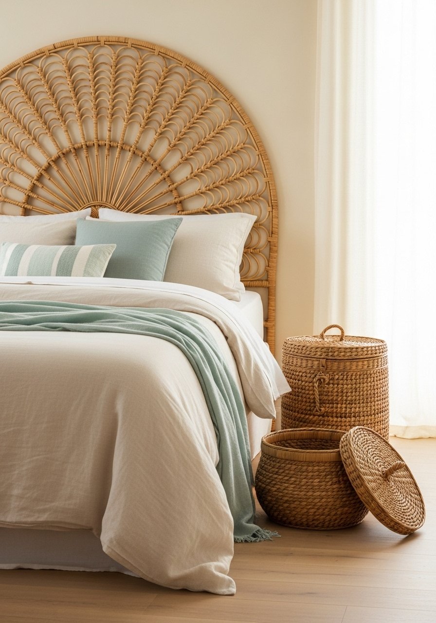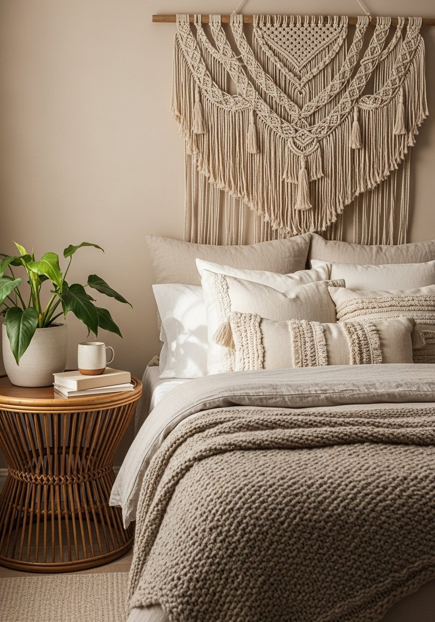 I added a rattan headboard and a round jute rug. Macramé wall art plus mixed-textile pillows creates relaxed depth. Tip: keep colors warm-cream, not stark white, for boho warmth. Common mistake: over-layering different patterns—limit to 2 patterns.