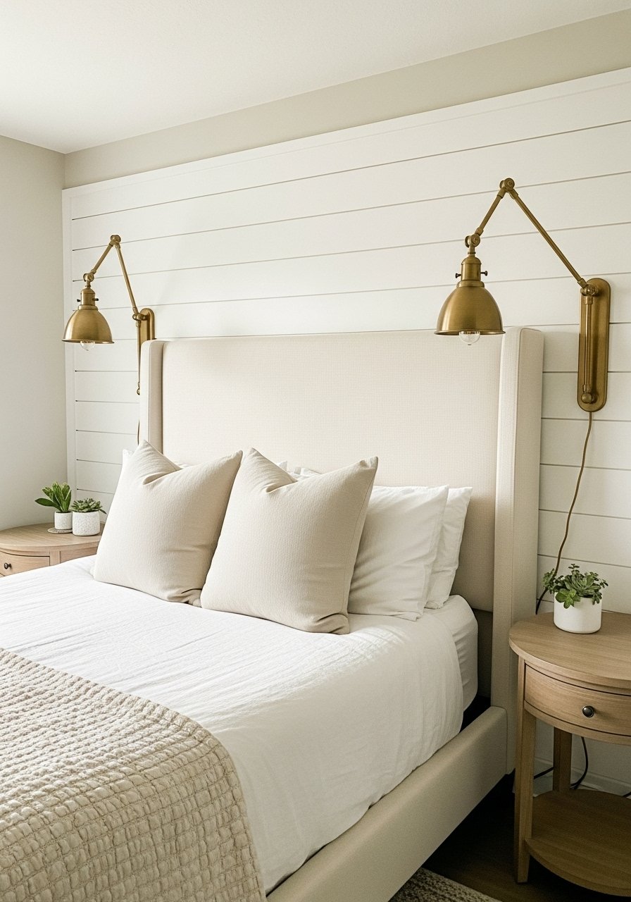 I installed a thin shiplap paneling behind the bed and flanked it with brass bedside lamps. The shiplap reads modern when painted soft cream. Works in photos and real life if you add textured linens. Mistake: not anchoring the wall with a sizable bed or mirror.