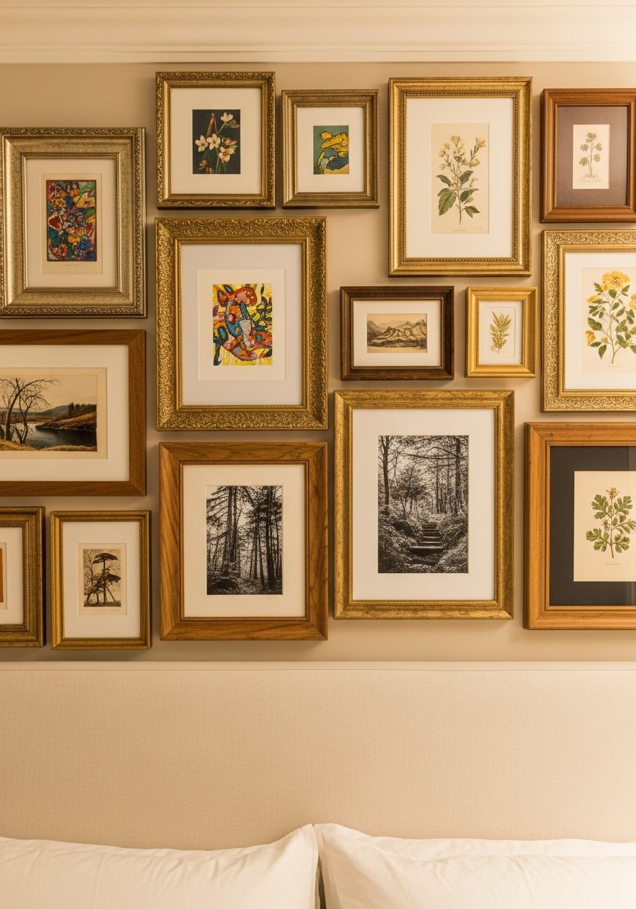 I thrifted frames and paired them with new white mats. The contrast of aged brass against cream bedding feels edited. Tip: use odd numbers and keep mats consistent. Avoid overcrowding the layout.