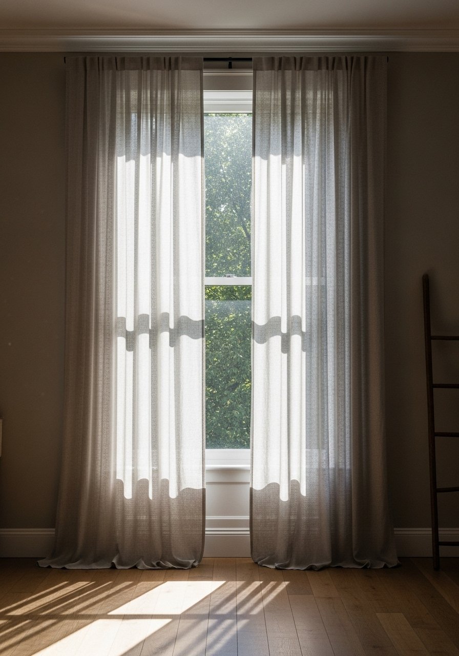 Hanging curtains from just below the ceiling makes low rooms read taller. I hang 96-inch linen panels about 4–6 inches above the window frame — it adds vertical drama. Use two panels per window for soft folds. What works: light-filtering fabric that still glows. What fails: curtains that stop mid-wall — they shrink the room visually. If you have 9-foot ceilings, go 96–108 inches.