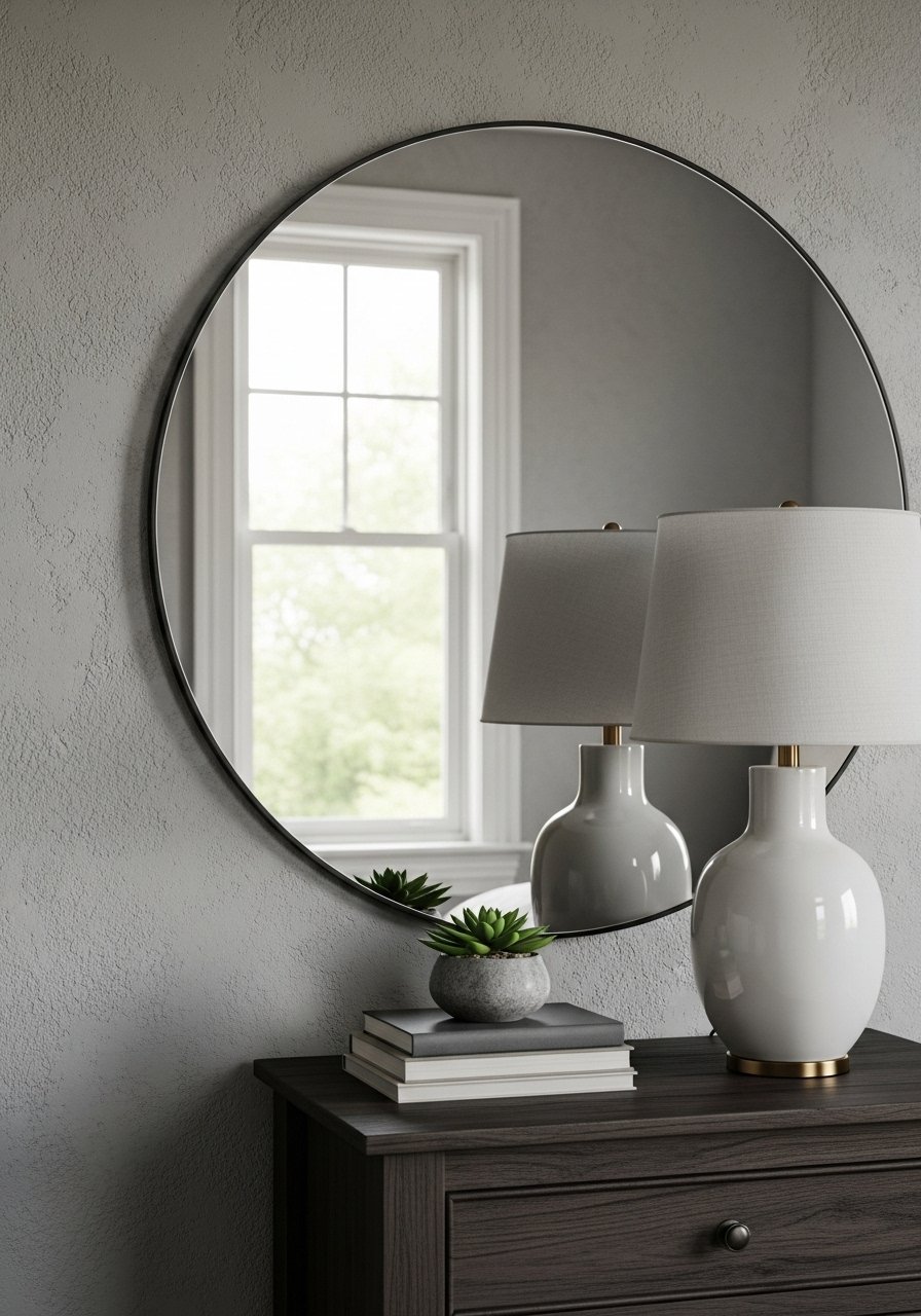 I leaned this 36-inch round mirror behind my nightstand and it instantly doubled the light. Mirrors create the illusion of space and make paint colors look truer. Styling tip: angle mirrors to catch natural light, not clutter. Mistake to avoid: hanging a mirror too high — it should center roughly at eye level when you sit on the bed.