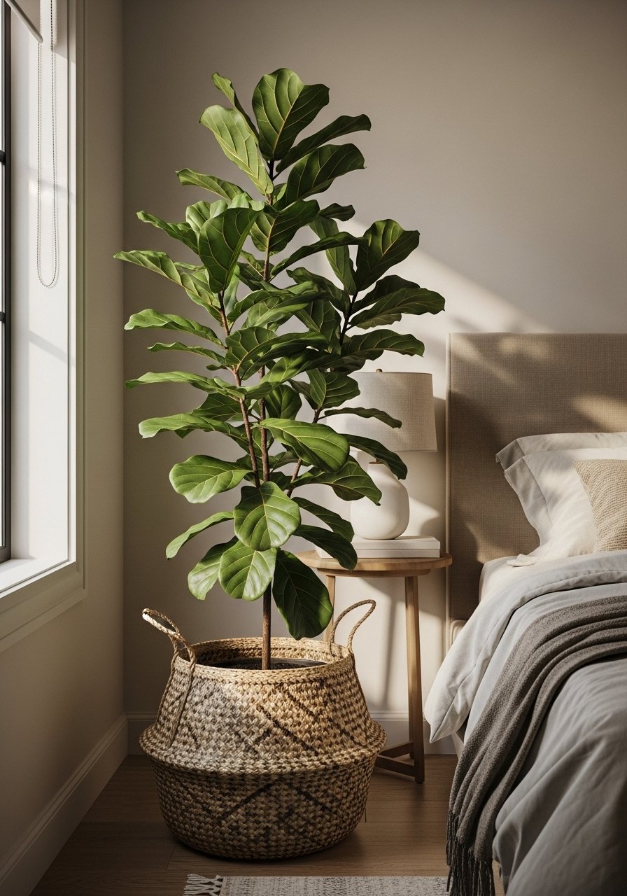 I invested in a single large fiddle leaf fig (artificial) for a tiny bedroom. It gives scale and makes the room feel finished. Real options like a snake plant or monstera are easy-care. Tip: a woven basket planter adds texture and hides the nursery pot. Mistake: scatter five tiny succulents — they don’t read as intentional.