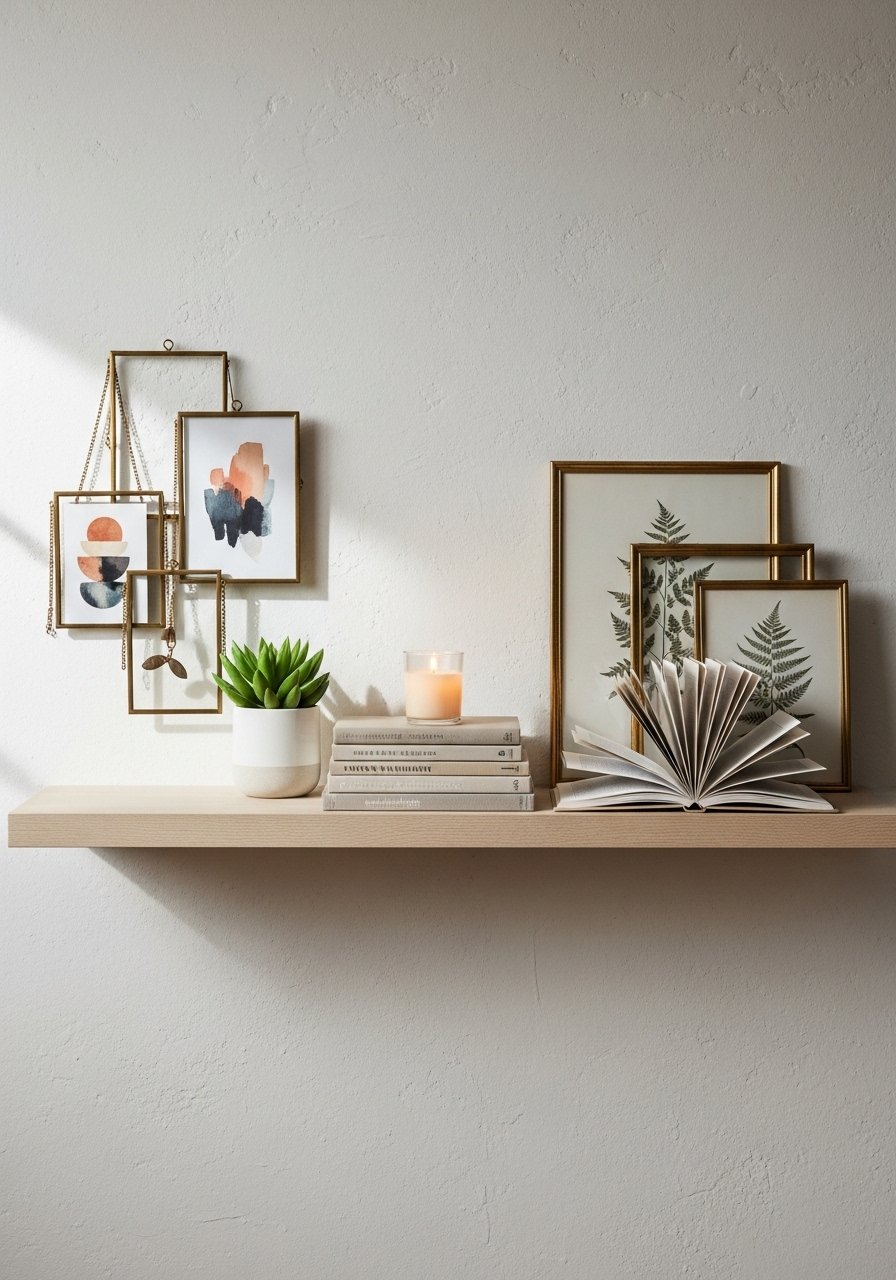 I installed one long floating shelf and rotate art, photos, and small ceramics. Use white oak floating shelves for a modern look. Styling tip: work in odd numbers and vary heights — tall vase, stack of two books, low frame. Mistake: try to fill every inch — negative space matters.